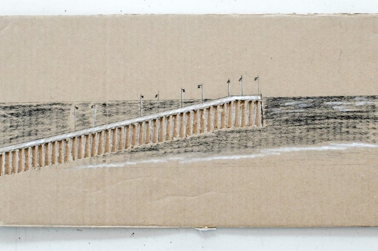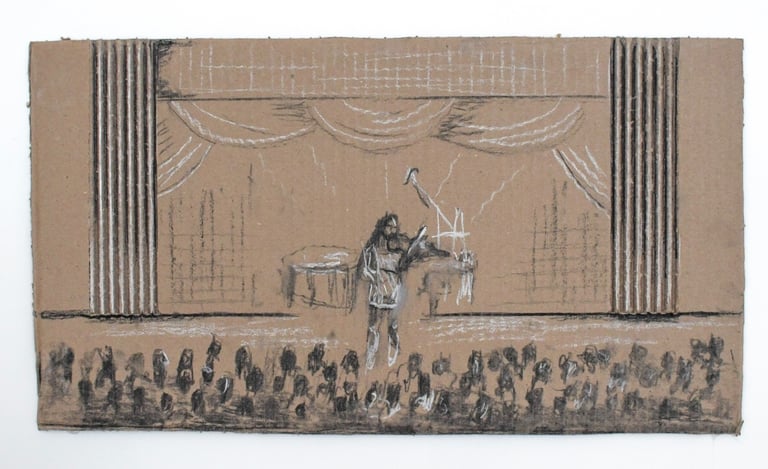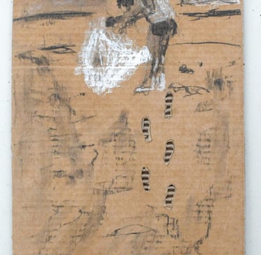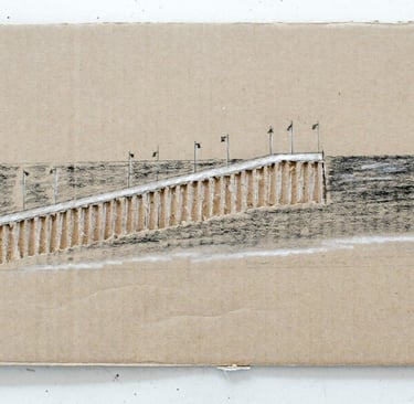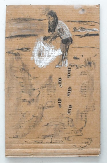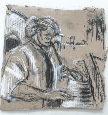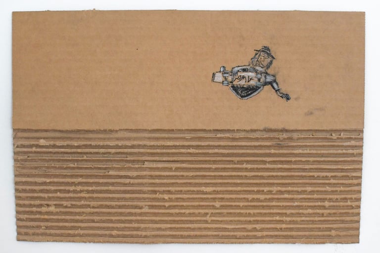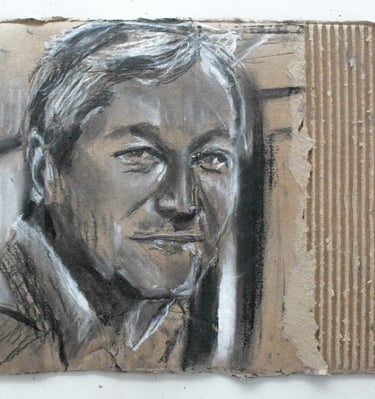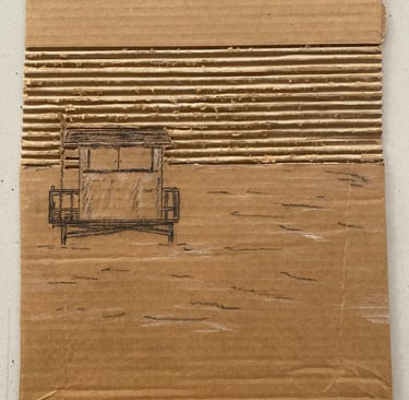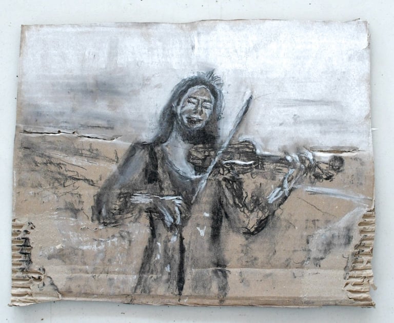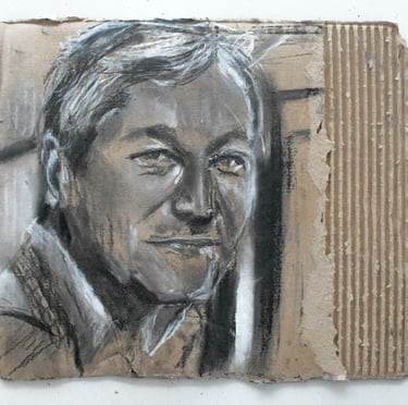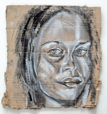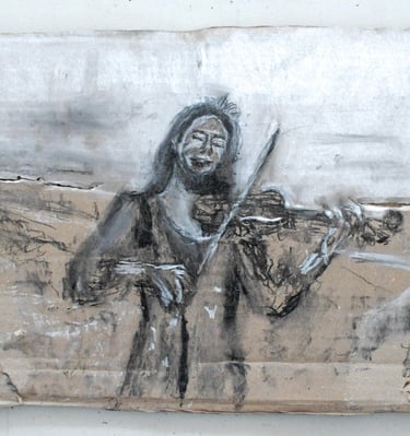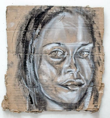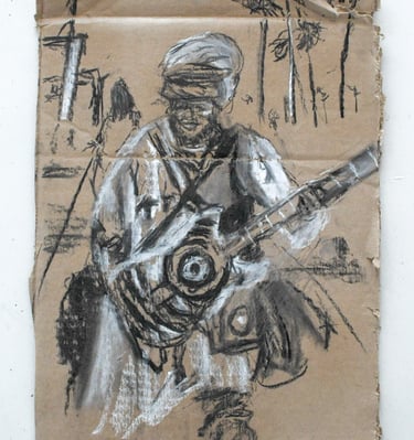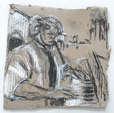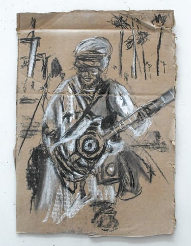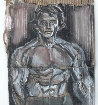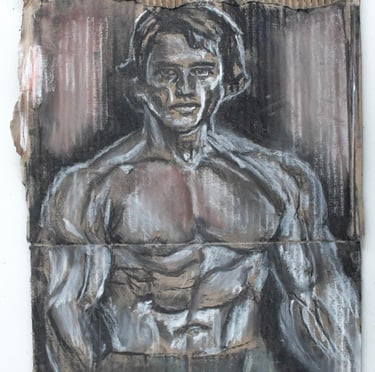 With basic materials, charcoal and reclaimed cardboard, this vibrant series captures the spirit of Venice Beach through portraits and scenes that honor its icons, past and present. Beloved street performers like Harry Perry and Pino fill the boardwalk with music, while film pioneers Roger Corman and Arnold Schwarzenegger left their marks on local history. The sands, surf, and palms frame both memory and myth. Today, emerging voices like Noella Jung carry that legacy forward—championing sustainability through beach cleanups, sharing her music with the community, and ultimately creating an art studio to unite these works. Together, these portraits celebrate Venice as a living canvas of culture.